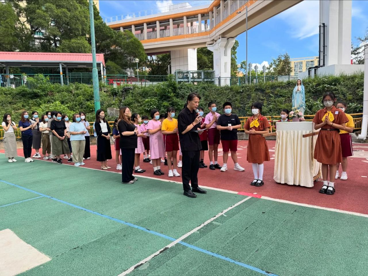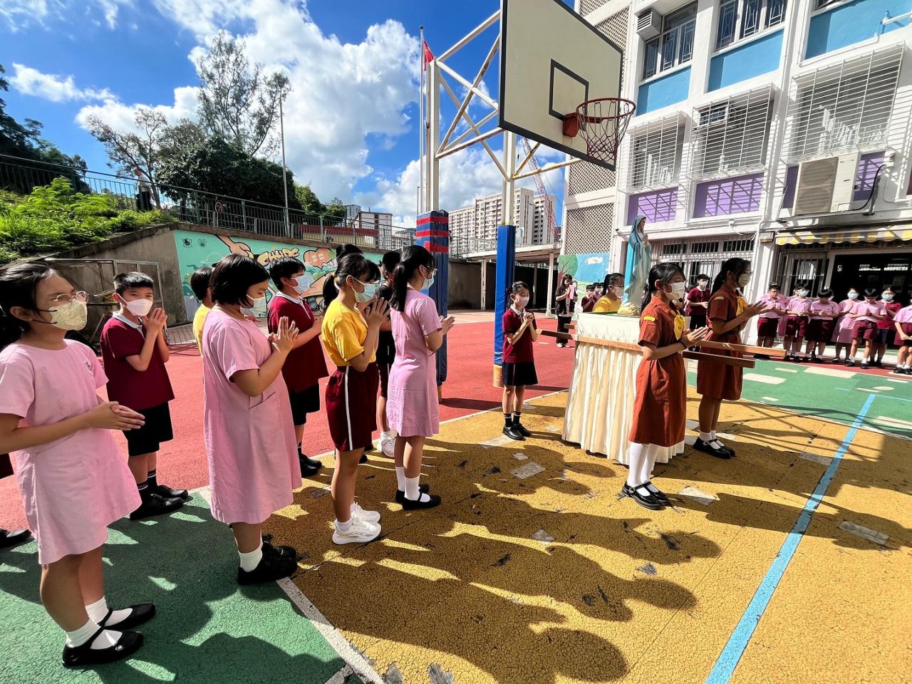 2025-10-14 十月是玫瑰月,本校舉行聖母像巡遊活動。同學們懷着孝愛之情,在聖母像巡遊的隊伍中,恭念玫瑰經,特別為世界和平祈禱。願聖母的慈愛陪伴我們每一天。#玫瑰月 #聖母像巡遊 #郭怡雅 #FCMS #深水埗 #40校網